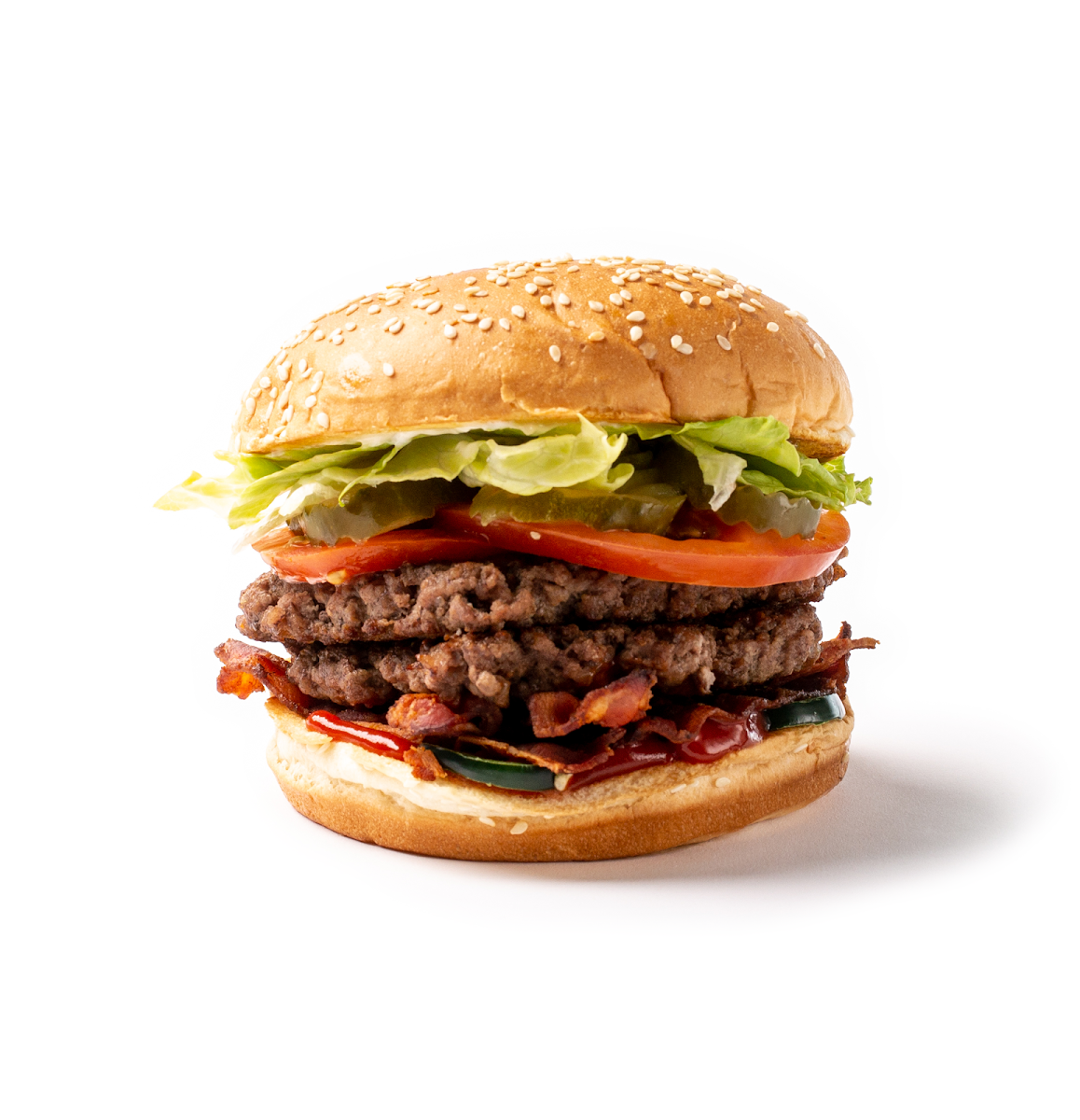 Two fresh high-quality beef patty, melted cheese with crispy, smoked bacon