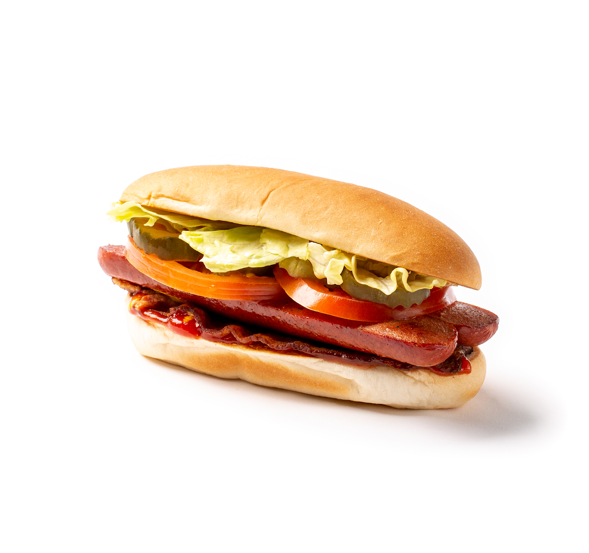 Our All-beef Hotdog with a layer of crispy, smoked bacon